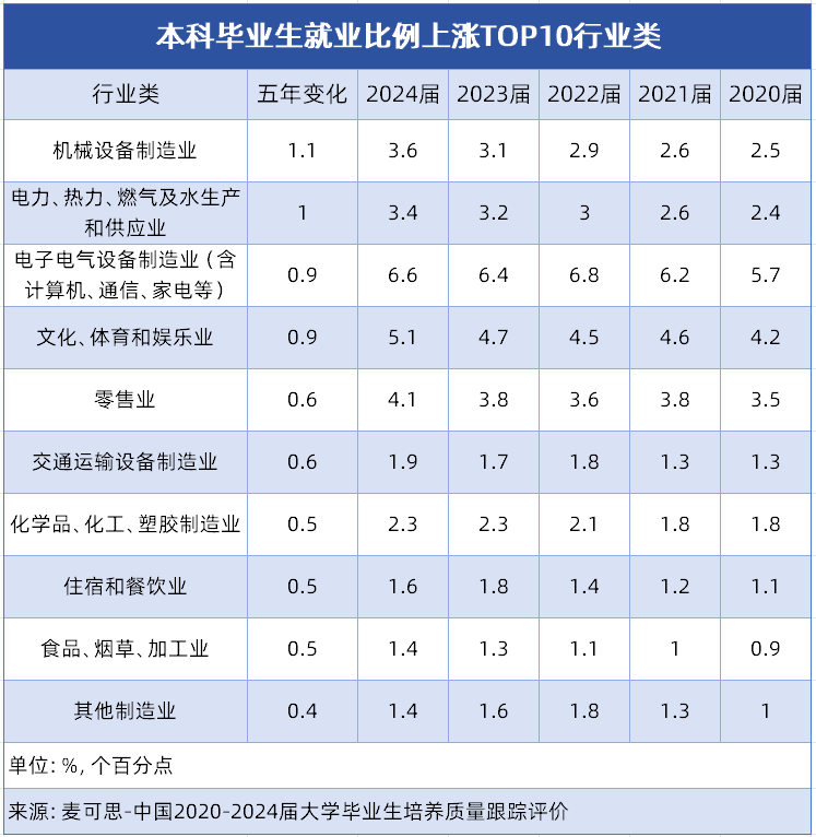 对于面对升学选择的高中生而言,专业的挑选关乎将来的职业成长轨迹。领会当下及将来的就业趋向,找准那些人才需求兴旺、成长潜力凸起的行业,能让专业选择更具前瞻性。近五年,我国本科结业生就业市场一批行业类凭仗强劲的成长动力,成为吸纳结业生的主要阵地。接下来小优将为你细致解读就业比例上涨TOP10行业类,找准适配的专业标的目的,为你的升学规划供给参考。 这10个行业类的分布特征明显:制制业相关行业占领从导,涵盖机械设备、电子电气设备等多个细分范畴,占TOP10中的6席。这一态势表现了我国制制业转型升级成效,高端配备制制、电子消息等焦点范畴对专业本科人才需求兴旺。同时,能源保障、消费升级、平易近生办事等类行业的稳步增加,也为大师将来职业选择供给了更多元标的目的,这些增加显著行业对应的专业范畴,值得沉点关心。机械设备制制业是支持国平易近经济成长的主要根本财产,当前正加快向高端化、智能化、绿色化转型,笼盖工业出产、高端配备制制、细密仪器研发等标的目的对本科手艺人才的需求持续攀升。该专业是机械类的保守王牌专业,焦点是培育控制机械设想、制制工艺和从动化节制等分析能力的手艺人才。学生将进修若何设想合适需求的机械产物,优化出产工艺流程,处理出产中的手艺难题,具备从产物研发到出产落地的全流程参取能力。报考需具备结实数学、物理根本,力学学问尤为环节。升入大学后需注沉实践,积极参取尝试、工业练习取学科竞赛,考取CAD工程师认证提拔合作力。就业面广,可入职汽车制制、工程机械、航空航天等企业,处置机械设想、工艺、设备办理等岗亭,需留意部门岗亭需驻厂或深切车间,工做相对艰辛,做息需贴合出产节拍,报考前可提前领会。 做为一门融合机械工程、从动化手艺、计较机科学的交叉学科,智能制制工程专业,聚焦于数字化工场扶植和智能配备研发,旨正在培育可以或许使用先辈手艺对保守出产模式进行升级主要根本财产,渗入于出产糊口各范畴。近年来正在精细化工财产沉点搀扶、新材料手艺立异鞭策下,行业正向高端化、绿色化转型,新材料研发、保守产物升级等需求,为本科手艺人才供给了不变且有潜力的就业平台。 该专业是化工行业的焦点专业,培育控制化学工程道理、化工工艺设想、化学反映工程、化工设备等学问的手艺人才,学生将具备化工出产流程设想、工艺优化、产质量量节制、化工设备研发等分析能力,是支持行业出产和手艺升级的焦点人才。数学根本,沉点控制无机化学、无机化学学问。大学进修中注沉尝试取练习,参取化工出产练习、工艺设想项目堆集经验,树立绿色化工取平安出产。就业可入职中石化、中石油等大型化工企业,及精细化工、新材料企业,处置工艺工程师、出产手艺办理、产物研发等岗亭,废气处置,不变性强。