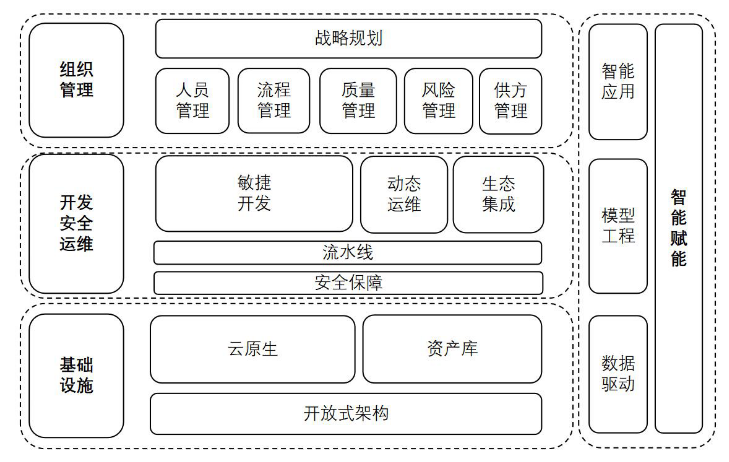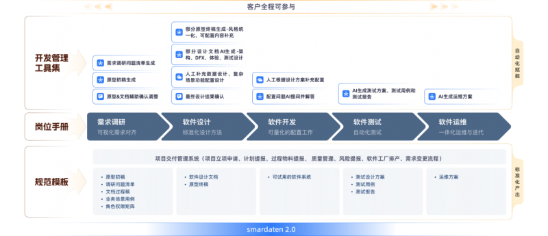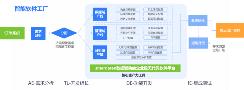 ●脚色专业化:低门槛的开辟东西和流水线式的组织模式,让流程上的每个脚色都能更快被打制为专业人员。按照软件交付次要环节,设立了需求阐发师AE、设置装备摆设工程师DE、集成测试IE等脚色,本能机能明白、职责清晰,代替了过往“全栈工程师包办一切”的恍惚定位。 ●智能赋能能力域:智能化开辟也是软件工场的主要进化标的目的。以数据驱动为焦点,借帮人工智能手艺,建立笼盖需求工程、设想、开辟、测试、运维等软件工程生成周期过程各环节的智能使用系统,推进软件开辟从动化、开辟流程从动化、运营管能化,最终达到“聪慧运营”的境地。