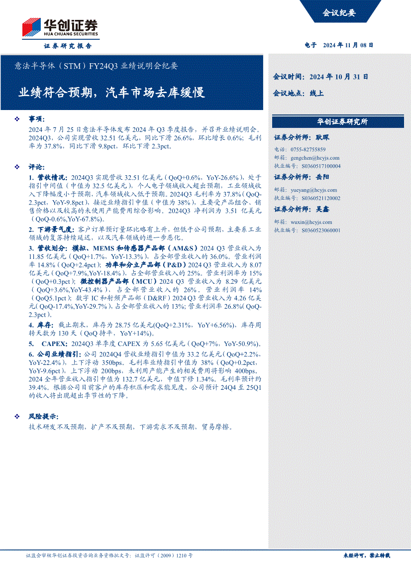 发布2024年Q3季度演讲,并召开业绩申明会。【慧博投研资讯】2024Q3,公司实现营收32。51亿美元,同比下滑26。6%,环比增加0。6%;毛利率为37。8%,同比下滑9。8pct,环比下滑2。3pct。(慧博投研资讯)评论:1。营收环境:2024Q3实现营收32。51亿美元(QoQ+0。6%,YoY-26。6%),处于两头值(中值为32。5亿美元),小我电子范畴收入超出预期,工业范畴收入下降幅度小于预期,汽车范畴收入低于预期。2024Q3毛利率为37。8%(QoQ2。3pct,YoY-9。8pct),接近业绩中值(中值为38%),次要受产物组合、发卖价钱以及较高的未利用产能费用分析影响。2024Q3净利润为3。51亿美元(QoQ-0。6%,YoY-67。8%)。 会议纪要 证监会审核华创证券投资征询营业资历批文号:证监许可(2009)1210号 4 ②停业利润率:2024Q3停业利润率为15%(QoQ+0。3pct)。 公司的功率和模仿产物组合博得design-win,取一家行业领先的人工智能办事器根本设备电源单位供应商合做,AI办事器使用对产物功率要求较高,将是快速增加的使用范畴。 证券研究演讲 证监会审核华创证券投资征询营业资历批文号:证监许可(2009)1210号 未经许可,转载会议纪要电子 2024年11月08日意法半导体(STM)FY24Q3业绩申明会纪要 会议时间:2024年10月31日会议地址:线上业绩合适预期,汽车市场去库迟缓 事项:2024年7月25日意法半导体发布2024年Q3季度演讲,并召开业绩申明会。 ②毛利率:2024Q3毛利率为37。8%(QoQ-2。3pct,YoY-9。8pct),接近业绩中值(中值为38%),发卖价钱以及较高的未利用产能费用分析影响。 图表3 公司24Q4业绩材料来历:意法半导体官网(二)公司2024全年瞻望①营收:公司2024全年停业收入中值为132。7亿美元,中值下修1。34%。 评论:1。营收环境:2024Q3实现营收32。51亿美元(QoQ+0。6%,YoY-26。6%),处于两头值(中值为32。5亿美元),小我电子范畴收入超出预期,工业范畴收入下降幅度小于预期,汽车范畴收入低于预期。 2024Q3毛利率为37。8%(QoQ-2。3pct,YoY-9。8pct),接近业绩中值(中值为38%),次要受产物组合、发卖价钱以及较高的未利用产能费用分析影响。 图表1 意法半导体24Q3业绩环境材料来历:意法半导体官网(二)营收划分1、模仿、MEMS和传感器产物部(AM&S) ①停业收入:2024Q3停业收入为11。85亿美元(QoQ+1。7%,YoY-13。3%),占全数停业收入的36。0%。 华创证券研究所总部广深分部上海分部地址:市西城区锦什坊街26号恒奥核心C座3A 地址:深圳市福田区喷鼻梅1061号中投国际商务核心A座19楼地址:上海市浦东新区花圃石桥33号花旗大厦12层邮编:100033邮编:518034邮编:200120 传实传实传实 会议室会议室会议室。 按照公司目前客户的库存积压和需求能见度,公司估计24Q4至25Q1的收入将呈现超出季候性的下降。 Q:公司规划加速300毫米晶圆的出产,对本钱收入的影响?公司能否会加速封闭200毫米晶圆产线? 会议纪要 证监会审核华创证券投资征询营业资历批文号:证监许可(2009)1210号 8 A:公司针对提拔300毫米晶圆出产率所需的根本设备已完成预备,公司规划将来三年的本钱收入程度将有所下降。 公司认为持续到25H1,纯电池驱动电车的全体数量仍不会增加,汽车制制商和全体供应链都将发生库存积压。 1。 用户间接或通过各类体例间接利用慧博投研资讯所供给的办事和数据的行为,请遏制利用慧博投研资讯所供给的全数办事。 Q:公司次要正在办事器电源架构中的哪一部门取得design-win? A:公司将通过硅碳化物、高电压MOSFET、GaN、CAM以及相变电压调理器和SPS来处理办事器电源架构的三大次要需求:电源、机架间电压处置和GPU供电。 Q:法国新的税收政策对公司的影响? A:目前公司的税率正在17%以内,法国的新税收政策可能对公司产能影响,但仅会对公司税率发生不脚1pcts的影响。 Q:因为欧洲地域部门工艺平台变化和工场封闭,中持久看,电动汽车的渗入率可否实现显著提拔? A:公司正在充实合作的市场中但愿持续提拔合作力,需要不竭打磨新产物新手艺,目前公司必需加大300毫米晶圆的出产规模,公司预期300毫米晶圆产线%的出产率。且下降趋向将正在将来几年间线亿美元。 Q:公司对来岁汽车行业的订价瞻望? A:汽车行业的价钱压力较暖和,公司估计25年将下降中个位数%。 本演讲所载消息不形成对所涉及证券的小我投资,也未考虑到个体客户特殊的投资方针、财政情况或需求。