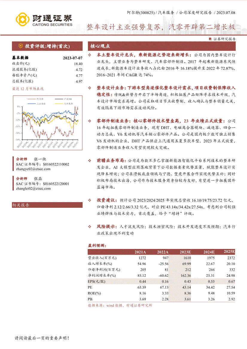 零部件制制营业:焦点零部件手艺壁垒高,23年业绩正式放量:公司16年起拓展零部件制制营业,现有DHT、电磁离合器模块、减速器、四合一动力总成、V6策动机等汽车焦点零部件产物。 丰硕的手艺材料取律例尺度数据库帮力立异研发能力螺旋式上升,是公司做为手艺办事型企业最主要的资产和财富。 阿尔特正在2019年就起头关心并进行滑板底盘相关手艺研发,正在汽车企业成心向向滑板底盘范畴发力时,阿尔特曾经建立了系统的针对滑板底盘研发的能力,将来落地的底盘产物还可以或许搭载公司自研自制的动力总成等焦点零部件,进一步打通营业链条。 设想公司手艺堆集丰硕,的运营机制使得公司办理和立异机制矫捷,为客户办事认识较强,响应速度快;此外,比拟于国外汽车设想公司,国内汽车设想公司更领会本土市场消费者的需乞降习惯,设想成本显著低于国外公司,具备较着的性价比劣势。 该模式下的企业性较强,可同时为多家汽车出产企业供给设想办事,能领受到客户正在出产和利用过程中的问题消息,有丰硕的产物问题库;但其行业特点决定了该模式正在设想过程中贫乏整车概念,会过度考虑成本及出产工艺而设想立异。 ①手艺——汽车设想是一项兼具艺术和手艺的多学科复杂行业,理论根本包罗工程力学、热力学、电工学等,营业内容涵盖制型设想、车身表里饰布局设想、动力底盘集成设想、整车机能开辟和验证等,流程系统和手艺尺度较为复杂。 ③资金——成熟的汽车设想公司需要具有开辟所需的专业的软硬件、不变的专业化办理团队、需要的试验及测试设备等,还需要通过大量的资金投入以引进和培育高端设想人才,故资金需求较大。 前瞻营业结构:公司是为数不多已控制新能源智能化平台系列手艺的整车研发企业,AI大模子使用落地布景下公司数据要素劣势显著,赋能整车设想实现降本增效;公司正在滑板底盘范畴取宁德、壁虎开展合做实现劣势互补;同时积极结构手艺出海,公司做为手艺办事商身份较为敌对,无望进一步拓展国外蓝海市场。 为了完告评分系统,请正在看完演讲后打个分,以便我们当前为您展现更优良的演讲。您也能够对本人点评取评分的演讲正在“我的云笔记”里进行复盘办理,便利您的研究取思虑,培育优良的思维习惯。 公司的单档电磁式DHT产物属于全球初创,可供应全体DHT产物或零丁电磁离合器部件;做为国内少少数可向市场发卖V6策动机的企业,公司的一代燃油策动机自2020年起为客户配套,二代机已于2022年成功焚烧。 V6策动机:公司是国内少少数可向市场发卖V6策动机的企业,第一代V6燃油策动机自2020年起为北汽BJ80配套搭载,下一步无望正在特种车型上实现量产搭载;第二代V6策动机正在2022年5月份已成功焚烧,该款策动机可使用汽油、天然气、甲醇、氢气等多种燃料,可以或许同时兼顾保守动力驱动、新能源夹杂动力驱动等多种能源驱动类型,满脚国6b(RDE)排放律例,正在商用车混动化海潮下具有很是广漠的使用空间。 此外,比拟于滑板底盘目前其他参取公司,如Canoo、Rivian、PixMoving、悠跑科技等新企业,公司做为上市公司有着必然的融资劣势,正在产物研发初期的手艺投入上本钱实力更强底气更脚。 国内大中型高端越野车市场,高端全尺寸皮卡市场,高端中巴客车市场以及婚配混动市场增程器1、齿轮采用平行轴布局形式,布局靠得住;2、采用多窗口形式,散热面积大,能耗低,功率效率高;3、传动平稳、乐音低;4、集成度高,体积小;5、可带驻车系统;6、合用范畴广。 公司早正在2014年于广西柳州成立V6策动机出产,由子公司柳州菱特担任策动机研发、制制相关营业,目前柳州菱特具有多品种型V6系列策动机出产能力,同时具备零件机能开辟、机械开辟、台架标定、靠得住性验证、振动及NVH噪声等试验验证能力,具有较强的合作劣势。 滑板底盘产物具有研发周期长、资金投入大、尺度要求高的特点,需要依托车型迭代,逐渐摸索客户取使用场景,目前还处于手艺尚不成熟、用户教育不充脚的阶段。 为进一步绑定焦点员工取公司的好处、充实调动办理人员取焦点的积极性,公司于2011、2015、2020年三次推出股权激励打算,并正在2022、2023两年内三次回购股份用于员工持股打算或者股权激励打算。 坐正在车企角度考虑,“软件定义汽车”趋向意味着将来的合作沉点将不再是消费者难以的底盘手艺,而是一系列智能化手艺。 做为一家研发型科技立异企业,公司多年来也一曲积极通过内部培育和外部吸纳的体例提拔中高级工程师、设想师数量,截至2022年6月,公司本科及以上学历员工占公司总人数71。32%,研发人员占比约80%,此中100多位是外籍专家,这些专家拥成心大利博通、宝马美国设想核心、通用汽车、日本三菱等汽车设想公司的开辟经验。 公司次要零部件产物有V6策动机(一代机、二代机)、电磁式DHT、电磁离合器模块、减速器、增程器以及四合一动力总成等,均为价值量高、手艺含量高的动力、传动焦点部件。 图22。整车设想营业流程数据来历:阿尔特招股仿单,财通证券研究所21 公司深度研究演讲/证券研究演讲潜心近十年,乘新能源春风送来新增加。 长城华冠汽车设想公司成立于2003年,是一家处置汽车整车设想开辟的专业汽车研发机构,取多家国表里整车制制企业成立优良的合做关系。 滑板底盘将集成智能电动车的所有能力